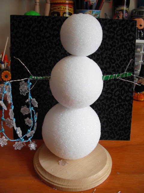 I used a wooden dowel inside the foam balls, which was set into the base and glued in, so this guy is VERY secure. The foam balls where then "strung" onto the dowel, and then masking tape was used to secure them together.